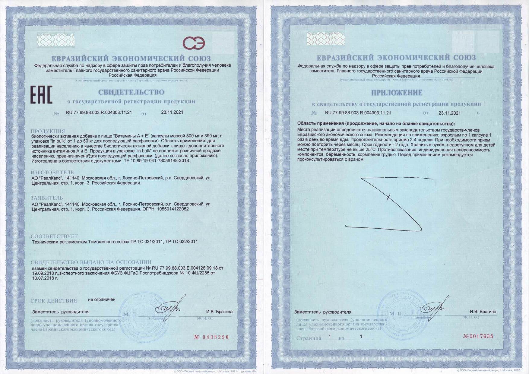 Биологически активная добавка к пище «Витамины А+Е» зарегистрирована Федеральной службой по надзору в сфере защиты прав потребителей и благополучия человека. Свидетельство о государственной регистрации RU.77.99.88.003.R.004303.11.21 от 23.11.2021 года, ТУ 10.89.19-033-78056148-2016.