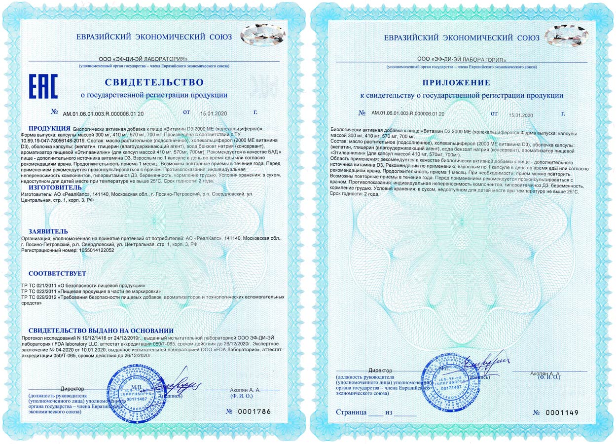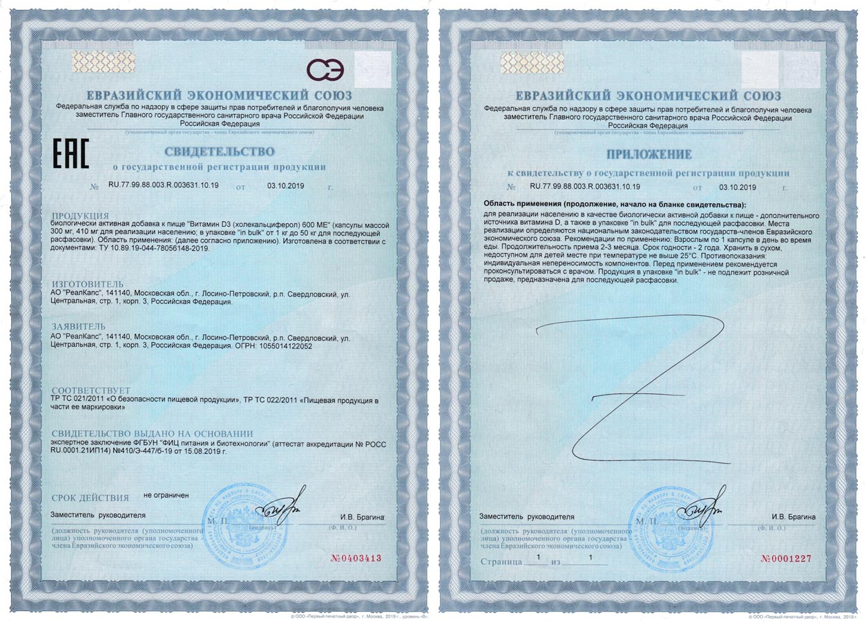 Биологически активная добавка к пище «Витамин D3 (холекальциферол) 600 ME» зарегистрирована Федеральной службой по надзору в сфере защиты прав потребителей и благополучия человека. Свидетельство о государственной регистрации № RU.77.99.88.003.R.003631.10.19 от 03.10.2019, ТУ 10.89.19-044-78056148-2019